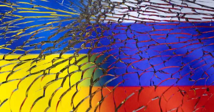 На цій ілюстрації, зробленій 1 березня 2022 року, крізь розбите скло видно прапори України та Росії. (REUTERS/Dado Ruvic/Illustration/File Photo)