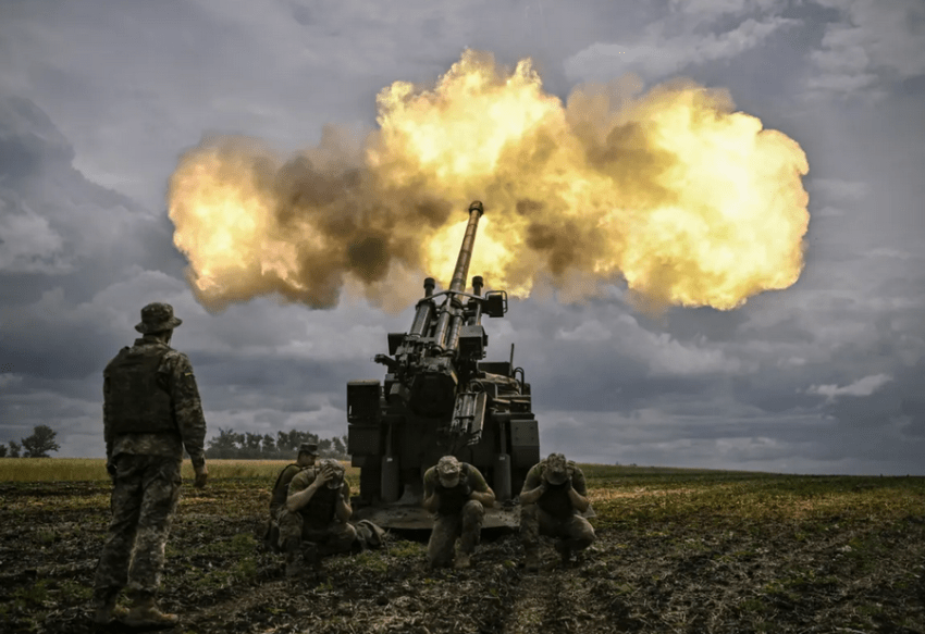 Українські військовослужбовці стріляють з французької самохідної гармати калібру 155 мм/52 мм “Цезар” у бік російських позицій на лінії зіткнення на сході України, 15 червня 2022 року. (Aris Messinis/AFP via Getty Images)
