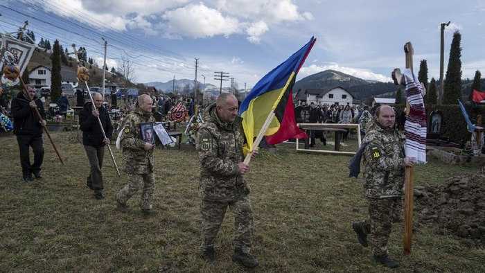 Українські військовослужбовці під час похорону Василя Бойчука на кладовищі в селі Ільці, Україна, 26 грудня 2023 року. (AP Photo/Evgeniy Maloletka)