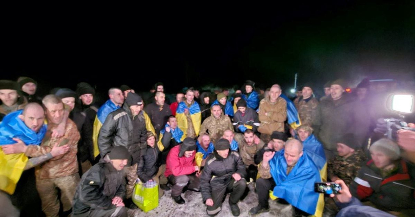 Українські військовополонені позують після обміну на тлі нападу Росії на Україну в невідомому місці в Україні на цій роздатковій фотографії, опублікованій 3 січня 2024 року. (Голова Офісу президента України Андрій Єрмак у Telegram)