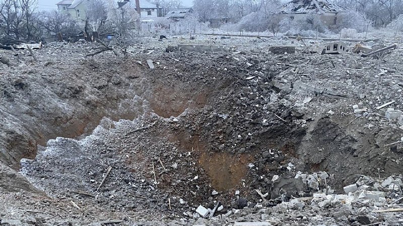 На цьому фото, наданому Українською службою порятунку, видно вирву від вибуху поруч із приватним будинком, зруйнованим після російського ракетного удару в Новомосковську, недалеко від Кривого Рогу, Україна, 8 січня 2024 року. (Українська служба порятунку)