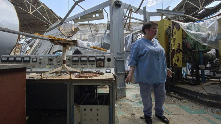 Галина Толстолуцька, завідувач відділу радіаційного ураження та радіаційного матеріалознавства Національного наукового центру “Харківський фізико-технічний інститут”, стоїть біля свого відділу, який був сильно пошкоджений внаслідок російської атаки у Харкові, Україна, 18 травня 2023 року. (AP Photo/Oleksandr Brynza, File)