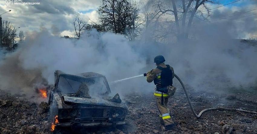 Пожежник гасить вогонь в автомобілі, знищеному під час російського ракетного удару в Миколаєві, Україна, 17 березня 2024 року. (Пресслужба Державної служби України з надзвичайних ситуацій у Миколаївській області)