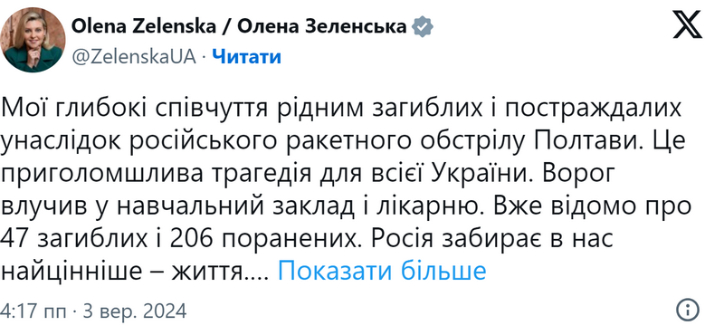 Уранці 3 вересня Росія атакувала балістичними ракетами Інститут зв’язку в Полтаві. Унаслідок атаки загинуло 47 осіб, понад 200 дістали поранення.
