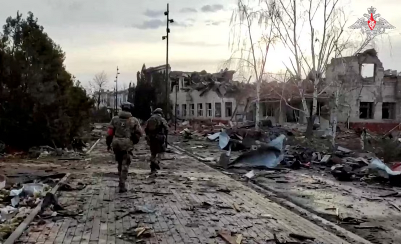 Російські військовослужбовці проходять повз зруйновану будівлю в місті Суджа, 15 березня 2025 року. (Міністерство оборони РФ)