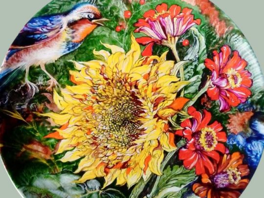 «Соняшники» Ван Гога відомі усьому світу. Та виявляється, малював серію робіт з соняшниками митець не випадково. До того, як стати художником, він працював артдилером та добре розумівся на тому, які картини можуть краще продаватися. На жаль, за своє життя Ван Гог продав не багато своїх картин, попри розуміння законів ринку мистецтва. Справжня слава прийшла до нього вже після смерті. Проте робота артдилером все ж була для Ван Гога у деякому сенсі доленосною. Працюючи в художньо-торгівельній фірмі у Гаазі, а потім Лондоні та Парижі, він почав добре розбиратися у мистецтві, відвідував музеї та галереї, а через певний час і сам почав малювати. Соняшники та іриси Ван Гога стали відомі на весь світ. Сьогодні ж наша тема — серпневі квіти у роботах українських фарфористів. Серед них, звичайно, і соняшник. У інтерв’ю «ФАКТАМ» колекціонерка української порцеляни та дослідниця її історії, авторка книг Людмила Карпінська-Романюк розповіла про роботи сучасних українських митців на цю тему. — Тарелі з квітковим розписом можуть стати справжньою родзинкою будь-якого інтер’єру та як святкового, так і щоденного сервірування, — говорить Людмила Карпінська-Романюк. – Такий посуд допоможе підняти настрій у похмурий день та створити відчуття тепла і затишку. Квіти серпня особливі — у них наче сконцентроване все тепло літа, всі його барви. Ось таріль Юлії Красної «Сонячна симфонія» (фото у заголовку). У центрі — соняшник. Ця квітка завжди повертається до сонця, що символізує прагнення до світла, правди, оптимізму й духовного піднесення. Вона дуже популярна у мистецтві через свій символізм та сонячний, оптимістичний настрій. І саме соняшники Ван Гог малював неодноразово. Цікаво, що це був не випадковий вибір, секрет криється у його першій професії. З шістнадцяти років він продавав твори мистецтва, працюючи у художньо-торгівельній компанії. Соняшники малювали також Поль Гоген, Клод Моне, Густав Клімт… — Соняшник Юлії Красної як живий… А як влучно названа картина — «Барвиста симфонія літа»! — Барвиста симфонія літа — це настрій натхнення та життєствердності. Поруч із соняшником розквітли яскраво-червоні та рожеві квіти. На тлі густої зелені миготять соковиті червоні ягідки, які символізують щедрість літа. Красу літа втілює барвистий птах. Кожен мазок на тарелі сповнений життя. Таріль Юлії Красної — не просто предмет декору, а вікно у світ щедрого українського літа. — А ось ще одна чудова робота Юлії Красної «Сльоза гладіолуса». Білі гладіолуси в краплях роси — втілення спокою, ніжності й світла. Ю. Красна. Таріль «Сльоза гладіолуса». Київ. 2028 Білосніжні пелюстки квітів ніжні, напівпрозорі. В центрі кожної квітки — пульсуючий вогник тичинок у ранковому серпанку. Краплинки роси підсилюють відчуття тендітності цих неймовірних квітів. Фон тарелі — м’яке шовкове полотно світла, мисткиня майстерно відтворила чарівність ранкової імли. Така робота дарує легкість і натхнення — неначе застигла у часі мить пробудження природи. — Хто ще з сучасних українських митців відтворив у розписі посуду квітучу красу літа? — Дуже гарні айстри у розписі мисткині Юлії Красної. Це не просто розпис — це розмова душі з природою, це дотик сонця на білосніжному фарфорі. Ця таріль авторства Юлії Красної — справжня ода літу. У центрі — розкішні айстри фіолетових і бузко