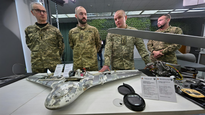 Українські військові експерти демонструють збиті дрони, які Росія використовує для нанесення ударів по критично важливих об’єктах інфраструктури та інших цілях в Україні, під час пресконференції в Києві 15 грудня 2022 року. (SERGEI SUPINSKY/AFP via Getty Images)