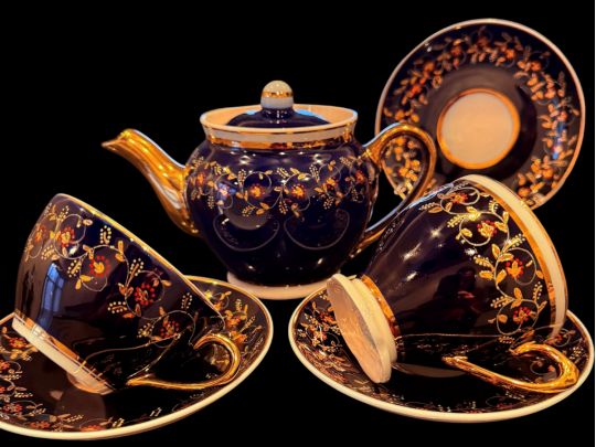 Вінтажні кобальтові сервізи вишукані та красиві. Пити чай чи каву з такої чашки — справжнє задоволення. В Україні чимало кобальтових сервізів було створено на Довбиському фарфоровому заводі. В інтерв’ю «ФАКТАМ» колекціонерка та дослідниця історії української порцеляни, авторка книг Людмила Карпінська-Романюк розповіла про сети, які нікого не залишать байдужими. – У кобальті є та сама глибина, що в зимовому небі перед снігопадом, коли синява густішає до межі кольору й здається, що ось-ось почне звучати, — говорить Людмила Карпінська-Романюк. — Золото на кобальті як полум’я свічки. Разом кобальт та золото творять дивним чином відчуття дому. Можливо, один із вишуканих кобальтових сервізів зберігся й у вашій родині? Ось, наприклад, чайний сервіз Олександра Яроша. Кобальт звучить у ньому як глибока вечірня тиша, в якій кожен рух набуває значення. Темно-синя поверхня фарфору — мов нічне небо, насичене й зосереджене, на якому золото мерехтить, як тепле світло лампи над столом. Олександр Ярош. Чайний сервіз форми «Довбиш 1», малюнок «Рушничок». Довбиський фарфоровий завод. 1970–ті — Краса! — Форма «Довбиш-1» — округла та врівноважена — тримає в собі спокій і гідність. Вона неначе запрошує до довгого, неспішного чаювання. Носики чайників вигнуті м’яко, ніби продовжують рух руки, ручки — теплі на дотик, продумані для щоденного користування, але з внутрішньою урочистістю. Декор «Рушничок» огортає предмети, мов пам’ять. Орнамент тягнеться по кобальтовому тлу тонкою золотою ниткою — як вишитий оберіг, що переходить з покоління в покоління. Квіти й завитки шепочуть про дім, про стіл, за яким збираються рідні та близькі, про звичайні речі, у яких живе традиція. У кожній чашці — відлуння рушника, у кожному блюдці — ритм спокійного життя. — Справді. – Олександр Ярош упродовж тривалого часу — з 1940-х до початку 1970-х років — обіймав посаду головного художника Довбиського фарфорового завода. Він створив численні моделі посуду та ваз, упроваджених у серійне виробництво, а також чимало виставкових авторських робіт. У 1985 році посаду головного художника та естафету творчого керівництва підприємства перейняла Анастасія Панчук-Медведкова. Під її керівництвом художня лабораторія підприємства здійснювала розробку як серійного ужиткового посуду, декорованого деколлю, так і обмежених серій рукотворних виробів з авторським розписом. Вражає красою чайний сервіз «Полісся» у розписі Анастасії Панчук-Медведкової. С. Гавриш, А. Панчук-Медведкова. Чайний сервіз форми «Полісся», декор «Квіточка». Довбиський фарфоровий завод, 1980-ті Цей сервіз — мов спогад про тихе поліське надвечір’я, де синява неба торкається землі, а золотаве сонце затримується на листі так довго, ніби не хоче прощатися з днем. Форма Сергія Гавриша «Полісся» — округла, тепла, гостинна. Вона ніби створена для родинних розмов. У чашках — відчуття долоні, що тримає світ, маленький, але свій. Декор «Квіточка» Анастасії Панчук-Медведкової — це золото і кобальт, які звучать разом, як голоси в народній пісні: насичений темний фон — мов глибина лісових озер, а золотисті візерунки — наче сонячні стежки крізь туман. — А які кавові кобальтові сервізи були створені? — Чудовий сервіз — «Цвіт папороті». Він — мов тиха містерія ночі. Глибокий, насичений, майже чорнильний кобальт нагадує нічне небо п