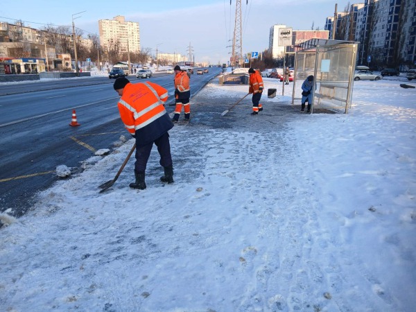 Понад 470 працівників у складі 69 бригад із ручного прибирання очищають від снігу та обробляють зупинки, вузькі тротуари, сходи, острівці безпеки, пішохідні переходи.
