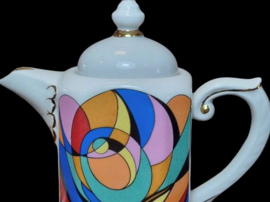 – Цей музичний жанр оркестрової музики став джерелом натхнення для багатьох українських фарфористів, — говорить Людмила Карпінська-Романюк. — Назва «Абстрактна симфонія» у чайно-кавовому сервізі форми Миколи Трегубова у розписі Вікторії Юсипів не є поетичною випадковістю. У сервізі фарфор «звучить» справді як симфонія: кольорові модулі накладаються один на одного, мов партії різних інструментів, ритм орнаменту переходить з чашок на чайник і молочник, створюючи відчуття безперервного руху. Фарби — бірюза, пурпур, оливкова, червона — як оркестрова палітра, де жоден колір не солює сам по собі, а працює в ансамблі. «Абстрактна симфонія» — сервіз, у якому модерна пластика й колір звучать як оркестр.